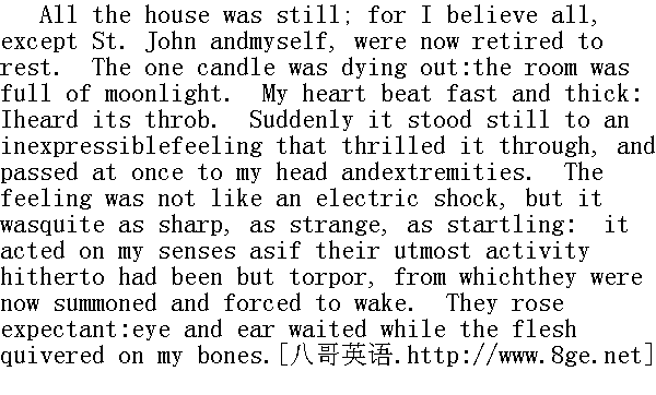 整座房子寂静无声。因为我相信,除了圣.约翰和我自己,所有的人都安息了。那一根蜡烛幽幽将灭,室内洒满了月光。我的心砰砰乱跳,我听见了它的搏动声。突然一种难以言表的感觉使我的心为之震颤,并立即涌向我的头脑和四肢,我的心随之停止了跳动。这种感觉不象一阵电击,但它一样地尖锐,一样地古怪,一样地惊人。它作用于我的感官,仿佛它们在这之前的最活跃时刻也只不过处于麻木状态。而现在它们受到了召唤,被弄醒了。它们起来了,充满了期待,眼睛和耳朵等候着,而肌肉在骨头上哆嗦。