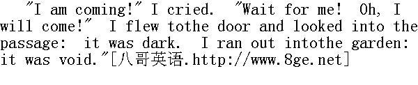 我来了!"我叫道。"等我一下!呵,我会来的!"我飞也似地走到门边,向走廊里窥视着,那时一灯漆黑,我冲进花园,里边空空如也。