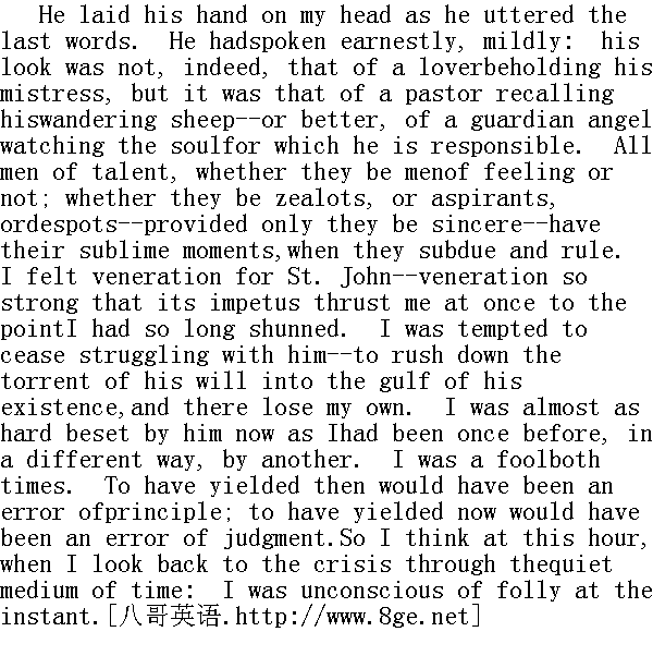 他说最后几个字时把手放在我头上,话说得很诚恳,也很委婉。说真的,他用的不是一个情人看女友的眼神,而是牧师召回迷途羔羊的目光--或许更好些,是一个守护神注视着他所监护的灵魂的目光,一切有才能的人,无论有无感情,无论是狂热者、还是追求者,抑或暴君--只要是诚恳的--在征服和统治期间都有令人崇敬的时刻。我崇敬圣.约翰--那么五体投地,结果所产生的冲击力一下子把我推到了我久久回避的那一点上。我很想停止同他搏斗--很想让他意志的洪流急速注入他生活的海峡,与我的水乳交融。现在我被他所困扰,几乎就象当初我受到另一个人的不同方式的困扰一样,两次我都做了傻瓜,在当时让步会是原则上的错误;而现在让步就会犯判断的错误。所以此时此刻我想,当我透过时间的平静中介,回头去看那危机时,当初我并没有意识到自己的愚蠢。