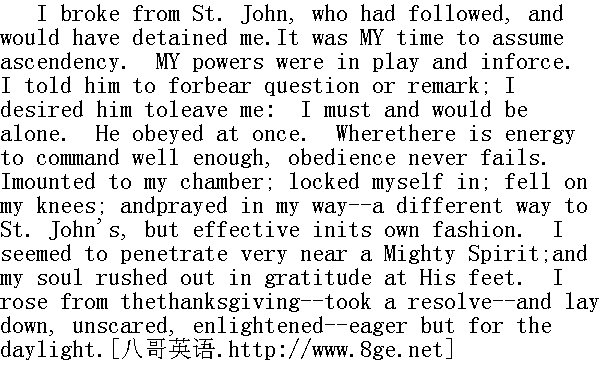 我挣脱了跟着我并想留住我的圣.约翰。该轮到我处于支配地位了。我的力量在起作用,在发挥威力了。我告诉他不要再提问题,或是再发议论了。我希望他离开我。我必须而且也宁愿一个人呆着。他立刻听从了。只要有魄力下命令,别人总是听话的。我上楼回卧室,把自己锁在房里,跪了下来,以我的方式祈祷着--不同于圣.约翰的方式,他自有其效果,我似乎已进入了一颗伟大的心灵,我的灵魂感激地冲出去来到他脚边。我从感恩中站起来--下了决心--随后躺了下来,并不觉得害怕,却受到了启发--急切地盼着白昼的来临。 The daylight came. I rose at dawn. I busied myself for an hour ortwo with arranging my things in my chamber, drawers, and wardrobe,in the order wherein I should wish to leave them during a briefabsence. Meantime, I heard St. John quit his room. He stopped atmy door: I feared he would knock--no, but a slip of paper waspassed under the door. I took it up. It bore these words - 白昼来临,拂晓时我便起身了。我忙了一两个小时,根据短期外出的需要,把房间、抽屉和衣橱里的东西作了安排。与此同时,我听到圣.约翰离开了房间,在我房门外停了一下,我担心他会敲门--不,他没有敲,却从门底下塞进来一个纸条,我拿起来一看,只见上面写着: "You left me too suddenly last night. Had you stayed but a littlelonger, you would have laid your hand on the Christian's cross andthe angel's crown. I shall expect your clear decision when I returnthis day fortnight. Meantime, watch and pray that you enter notinto temptation: the spirit, I trust, is willing, but the flesh, Isee, is weak. I shall pray for you hourly.--Yours, ST. JOHN."" 咋晚你离开我太突然了。要是你再呆一会儿,你就会把手放在基督的十字架和天使的皇冠上了。二周后的今天我回来时盼你已作出明确的决定。同时,你要留心并祈祷,愿自己不受诱惑。我相信,灵是愿意的;但我也看到,肉是软弱的。我会时时为你祈祷--你的,圣.约翰。" "My spirit," I answered mentally, "is willing to do what is right;and my flesh, I hope, is strong enough to accomplish the will ofHeaven, when once that will is distinctly known to me. At any rate,it shall be strong enough to search--inquire--to grope an outletfrom this cloud of doubt, and find the open day of certainty."" 我的灵,"我心里回答,"乐意做一切对的事情,我希望我的肉也很坚强,一旦明确上帝的意志、便有力量去实现它。无论如何,我的肉体是够坚强的,让我可以去探求--询问--摸索出路,驱散疑云,找到确然无疑的晴空。" It was the first of June; yet the morning was overcast and chilly:rain beat fast on my casement. I heard the front-door open, and St.John pass out. Looking through the window, I saw him traverse thegarden. He took the way over the misty moors in the direction ofWhitcross--there he would meet the coach. 这是六月一日。早晨,满天阴云,凉气袭人,骤雨敲窗。我听见前门开了,圣.约翰走了出去。透过窗子,我看到他走过花园,踏上雾蒙蒙的荒原,朝惠特克劳斯方向走去,--那儿他将搭上马车。