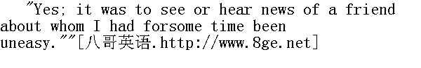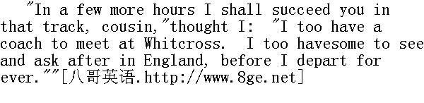 是的,去看看,或者打听一下一个朋友的消息,我已为他担心了好久了。" They might have said, as I have no doubt they thought, that they hadbelieved me to be without any friends save them: for, indeed, I hadoften said so; but, with their true natural delicacy, they abstainedfrom comment, except that Diana asked me if I was sure I was wellenough to travel. I looked very pale, she observed. I replied,that nothing ailed me save anxiety of mind, which I hoped soon toalleviate. 正如我明白她们在想的那样,她们本可以说,一直以为除了她们,我没有别的朋友,其实我也总是这么讲的。但出于天生真诚的体贴,她们没有发表任何议论,除了黛安娜问我身体是否确实不错,是否适宜旅行。她说我脸色苍白。我回答说没有什么不适,只不过内心有些不安,但相信不久就会好的。 It was easy to make my further arrangements; for I was troubled withno inquiries--no surmises. Having once explained to them that Icould not now be explicit about my plans, they kindly and wiselyacquiesced in the silence with which I pursued them, according to methe privilege of free action I should under similar circumstanceshave accorded them. 于是接下来的安排就容易了,因为我不必为刨根究底和东猜西想而烦恼。我一向她们解释,现在还不能明确宣布我的计划,她们便聪明而善解人意地默许我悄然进行,给了我在同样情况下也会给予她们的自由行动的特权。 I left Moor House at three o'clock p.m., and soon after four I stoodat the foot of the sign-post of Whitcross, waiting the arrival ofthe coach which was to take me to distant Thornfield. Amidst thesilence of those solitary roads and desert hills, I heard itapproach from a great distance. It was the same vehicle whence, ayear ago, I had alighted one summer evening on this very spot--howdesolate, and hopeless, and objectless! It stopped as I beckoned.I entered--not now obliged to part with my whole fortune as theprice of its accommodation. Once more on the road to Thornfield, Ifelt like the messenger-pigeon flying home. 下午三点我离开了沼泽居,四点后不久,我便已站在惠特克劳斯的路牌下,等待着马车把我带到遥远的桑菲尔德去。在荒山野路的寂静之中,我很远就听到了马车靠近了。一年前的一个夏夜,我就是从这辆马车上走下来,就在这个地方--那么凄凉,那么无望,那么毫无目的!我一招手马车便停了下来。我上了车--现在已不必为一个座位而倾囊所有了。我再次踏上去桑菲尔德的路途,真有信鸽飞回家园之感。 It was a journey of six-and-thirty hours. I had set out fromWhitcross on a Tuesday afternoon, and early on the succeedingThursday morning the coach stopped to water the horses at a waysideinn, situated in the midst of scenery whose green hedges and largefields and low pastoral hills (how mild of feature and verdant ofhue compared with the stern North-Midland moors of Morton!) met myeye like the lineaments of a once familiar face. Yes, I knew thecharacter of this landscape: I was sure we were near my bourne. 这是一段三十六小时的旅程。星期二下午从惠特克劳斯出发,星期四一早,马车在路边的一家旅店停下,让马饮水。旅店座落在绿色的树篱、宽阔的田野和低矮的放牧小山之中(与中北部莫尔顿严峻的荒原相比,这里的地形多么柔和,颜色何等苍翠!),这番景色映入我眼帘,犹如一位一度熟悉的人的面容。不错,我了解这里景物的特点,我确信已接近目的地了。