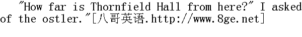 桑菲尔德离这儿有多远?"我问旅店侍马人。 "Just two miles, ma'am, across the fields."" 穿过田野走两英里就到了,小姐。" "My journey is closed," I thought to myself. I got out of thecoach, gave a box I had into the ostler's charge, to be kept till Icalled for it; paid my fare; satisfied the coachman, and was going:the brightening day gleamed on the sign of the inn, and I read ingilt letters, "The Rochester Arms." My heart leapt up: I wasalready on my master's very lands. It fell again: the thoughtstruck it:-" 我的旅程结束了,"我暗自思忖。我跳下马车,把身边的一个盒子交给侍马人保管,回头再来提取,付了车钱,给足了马夫,便启程上路了。黎明的曙光照在旅店的招牌上,我看到了镀金的字母"罗切斯特纹章",心便砰砰乱跳,原来我已来到我主人的地界。但转念一想,又心如止水了。 "Your master himself may be beyond the British Channel, for aughtyou know: and then, if he is at Thornfield Hall, towards which youhasten, who besides him is there? His lunatic wife: and you havenothing to do with him: you dare not speak to him or seek hispresence. You have lost your labour--you had better go no farther,"urged the monitor. "Ask information of the people at the inn; theycan give you all you seek: they can solve your doubts at once. Goup to that man, and inquire if Mr. Rochester be at home."" 也许你的主人在英吉利海峡彼岸。况且,就是他在你匆匆前往的桑菲尔德府,除了他还有谁也在那里呢?还有他发了疯的妻子,而你与他毫不相干。你不敢同他说话,或者前去找他。你劳而无功--你还是别再往前走吧,"冥冥中的监视者敦促道。"从旅店里的人那里探听一下消息吧,他们会提供你寻觅的一切情况,立刻解开你的疑团,走到那个人跟前去,问问罗切斯特先生在不在家。"