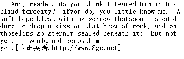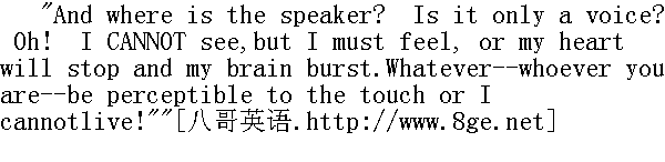 你再要喝一点吗,先生?杯子里的水让我泼掉了一半,"我说。 "WHO is it? WHAT is it? Who speaks?"" 谁?什么?谁在说话?" "Pilot knows me, and John and Mary know I am here. I came only thisevening," I answered." 派洛特认得我,约翰和玛丽知道我在这里,我今天晚上才来,"我回答。 "Great God!--what delusion has come over me? What sweet madness hasseized me?"" 天哪!--我是在痴心梦想吗?什么甜蜜的疯狂迷住了我?" "No delusion--no madness: your mind, sir, is too strong fordelusion, your health too sound for frenzy."" 不是痴心梦想--不是疯狂。先生,你的头脑非常健康,不会陷入痴心梦想;你的身体十分强壮,不会发狂。"