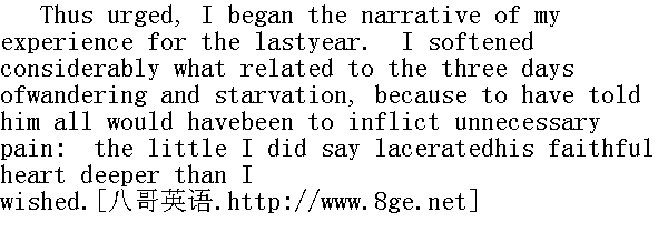 于是在他的敦促之下,我开始叙述去年的经历了。我大大淡化了三天的流浪和挨饿的情景,因为把什么都告诉他,只会增加他不必要的痛苦。但是我确实告诉他的一丁点儿,也撕碎了他那颗忠实的心,其严重程度超出了我的预料。