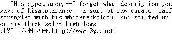 他的外表--我忘了你是怎么样描述他的外表的了--那种没有经验的副牧师,扎着白领巾,弄得气都透不过来;穿着厚底高帮靴,顶得像踏高跷似的,是吧?"
