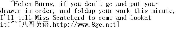 海伦.彭斯,要是这会儿你不去整理抽屉,收拾你的针线活儿,我要告诉斯卡查德小姐,请她来看看了。" Helen sighed as her reverie fled, and getting up, obeyed the monitorwithout reply as without delay. 海伦的幻想烟消云散,她长叹一声,站了起来,没有回答,也没有耽搁,便服从了这位班长。 My first quarter at Lowood seemed an age; and not the golden ageeither; it comprised an irksome struggle with difficulties inhabituating myself to new rules and unwonted tasks. The fear offailure in these points harassed me worse than the physicalhardships of my lot; though these were no trifles. 在罗沃德度过的一个季度,仿佛是一个时代,而且并不是黄金时代。我得经历一场恼人的搏斗,来克服困难,适应新的规矩和不熟悉的工作。我担心这方面出错。为此所受的折磨,甚过于我命里注定肉体上要承受的艰苦,虽说艰苦也并不是小事。 During January, February, and part of March, the deep snows, and,after their melting, the almost impassable roads, prevented ourstirring beyond the garden walls, except to go to church; but withinthese limits we had to pass an hour every day in the open air. Ourclothing was insufficient to protect us from the severe cold: wehad no boots, the snow got into our shoes and melted there: ourungloved hands became numbed and covered with chilblains, as wereour feet: I remember well the distracting irritation I endured fromthis cause every evening, when my feet inflamed; and the torture ofthrusting the swelled, raw, and stiff toes into my shoes in themorning. Then the scanty supply of food was distressing: with thekeen appetites of growing children, we had scarcely sufficient tokeep alive a delicate invalid. From this deficiency of nourishmentresulted an abuse, which pressed hardly on the younger pupils:whenever the famished great girls had an opportunity, they wouldcoax or menace the little ones out of their portion. Many a time Ihave shared between two claimants the precious morsel of brown breaddistributed at tea-time; and after relinquishing to a third half thecontents of my mug of coffee, I have swallowed the remainder with anaccompaniment of secret tears, forced from me by the exigency ofhunger. 在一月、二月和三月的部分日子里,由于厚厚的积雪,以及化雪后道路几乎不通,我们的活动除了去教堂,便被困在花园的围墙之内了。但就在这个牢笼内,每天仍得在户外度过一小时。我们的衣服不足以御寒。大家没有靴子,雪灌进了鞋子,并在里面融化。我们没有手套,手都冻僵了,像脚上一样,长满了冻疮。每晚我的双脚红肿,早上又得把肿胀、疼痛和僵硬的脚趾伸进鞋子,一时痛痒难熬,至今记忆犹新。食品供应不足也令人沮丧,这些孩子都正是长身体的年纪,胃口很好,而吃的东西却难以养活一个虚弱的病人。营养缺乏带来了不良习气,这可苦了年纪较小的学生。饥肠辘辘的大龄女生一有机会,便连哄带吓,从幼小学生的份里弄到点吃的。有很多回,我在吃茶点时把那一口宝贵的黑面包分给两位讨食者,而把半杯咖啡给了第三位,自己便狼吞虎唱地把剩下的吃掉,一面因为饿得发慌而暗暗落泪。 Sundays were dreary days in that wintry season. We had to walk twomiles to Brocklebridge Church, where our patron officiated. We setout cold, we arrived at church colder: during the morning servicewe became almost paralysed. It was too far to return to dinner, andan allowance of cold meat and bread, in the same penuriousproportion observed in our ordinary meals, was served round betweenthe services. 冬季的星期日沉闷乏味。我们得走上两里路,到保护人所主持的布罗克布里奇教堂去。出发的时候很冷,到达的时刻就更冷了。早祷时我们几乎都已冻僵,这儿离校太远,不能回去用饭,两次祷告之间便吃一份冷肉和面包,份量也跟平时的饭食一样,少得可怜。