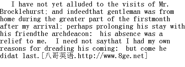 我还没有提到布罗克赫斯特先生的造访,其实这位先生在我抵达后第一个月的大部分日子里,都不在家,也许他在朋友副主教那里多逗留了些时间。他不在倒使我松了口气,不必说我自有怕他来的理由,但他终究还是来了。 One afternoon (I had then been three weeks at Lowood), as I wassitting with a slate in my hand, puzzling over a sum in longdivision, my eyes, raised in abstraction to the window, caught sightof a figure just passing: I recognised almost instinctively thatgaunt outline; and when, two minutes after, all the school, teachersincluded, rose en masse, it was not necessary for me to look up inorder to ascertain whose entrance they thus greeted. A long stridemeasured the schoolroom, and presently beside Miss Temple, whoherself had risen, stood the same black column which had frowned onme so ominously from the hearthrug of Gateshead. I now glancedsideways at this piece of architecture. Yes, I was right: it wasMr. Brocklehurst, buttoned up in a surtout, and looking longer,narrower, and more rigid than ever. 一天下午(那时我到罗沃德已经三星期了),我手里拿了块写字板坐着,正为长除法中的一个总数发窘,眼睛呆呆地望着窗外,看到有一个人影闪过。我几乎本能地认出了这瘦瘦的轮廓。因此两分钟后,整个学校的人,包括教师在内都全体起立时,我没有必要抬起头来后过究竟,便知道他们在迎接谁进屋了。这人大步流星走进教室。眨眼之间,在早已起立的坦普尔小姐身边,便竖起了同一根黑色大柱,就是这根柱子曾在盖茨黑德的壁炉地毯上不祥地对我皱过眉。这时我侧目瞟了一眼这个建筑物。对,我没有看错,就是那个布罗克赫斯特先生,穿着紧身长外衣,扣紧了钮扣,看上去越发修长、狭窄和刻板了。 I had my own reasons for being dismayed at this apparition; too wellI remembered the perfidious hints given by Mrs. Reed about mydisposition, &c.; the promise pledged by Mr. Brocklehurst to appriseMiss Temple and the teachers of my vicious nature. All along I hadbeen dreading the fulfilment of this promise,--I had been lookingout daily for the "Coming Man," whose information respecting my pastlife and conversation was to brand me as a bad child for ever: nowthere he was. 见到这个幽灵,我有理由感到丧气。我记得清清楚楚,里德太太曾恶意地暗示过我的品行等等,布罗克赫斯特先生曾答应把我的恶劣本性告诉坦普尔小姐和教师们。我一直害怕这一诺言会得到实现--每天都提防着这个"行将到来的人"。他的谈话和对我往事的透露,会使我一辈子落下个坏孩子的恶名,而现在他终于来了。 He stood at Miss Temple's side; he was speaking low in her ear: Idid not doubt he was making disclosures of my villainy; and Iwatched her eye with painful anxiety, expecting every moment to seeits dark orb turn on me a glance of repugnance and contempt. Ilistened too; and as I happened to be seated quite at the top of theroom, I caught most of what he said: its import relieved me fromimmediate apprehension. 他站在坦普尔小姐身旁,跟她在小声耳语。毫无疑问他在说我坏话,我急切而痛苦地注视着她的目光,无时无刻不期待着她乌黑的眸子转向我,投来厌恶与蔑视的一瞥。我也细听着,因为碰巧坐在最靠房子头上的地方,所以他说的话,一大半都听得见。谈话的内容消除了我眼前的忧虑。 "I suppose, Miss Temple, the thread I bought at Lowton will do; itstruck me that it would be just of the quality for the calicochemises, and I sorted the needles to match. You may tell MissSmith that I forgot to make a memorandum of the darning needles, butshe shall have some papers sent in next week; and she is not, on anyaccount, to give out more than one at a time to each pupil: if theyhave more, they are apt to be careless and lose them. And, O ma'am!I wish the woollen stockings were better looked to!--when I was herelast, I went into the kitchen-garden and examined the clothes dryingon the line; there was a quantity of black hose in a very bad stateof repair: from the size of the holes in them I was sure they hadnot been well mended from time to time."" 坦普尔小姐,我想在洛顿买的线是管用的,质地正适合做白布衬衣用,我还挑选了同它相配的针。请你告诉史密斯小姐,我忘掉了买织补针的事。不过下星期我会派人送些纸来,给每个学生的一次不得超过一张,给多了,她们容易粗枝大叶,把它们弄丢了。啊,小姐!但愿你们的羊毛袜子能照看得好些!上次我来这里的时候到菜园子里转了一下,仔细瞧了瞧晾在绳子上的衣服,看见有不少黑色长袜都该补了,从破洞的大小来看,肯定一次次都没有好好修补。"
