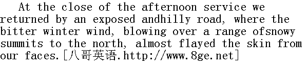 下午的祷告结束以后,我们沿着一条无遮无拦的山路回校。刺骨的寒风,吹过大雪覆盖的山峰,刮向北边来,几乎要从我们的脸上刮去一层皮。 I can remember Miss Temple walking lightly and rapidly along ourdrooping line, her plaid cloak, which the frosty wind fluttered,gathered close about her, and encouraging us, by precept andexample, to keep up our spirits, and march forward, as she said,"like stalwart soldiers." The other teachers, poor things, weregenerally themselves too much dejected to attempt the task ofcheering others. 我至今仍然记得,坦普尔小姐轻快地走在我们萎靡不振的队伍旁边,寒风吹得她的花呢斗篷紧贴在身上。她一面训导,一面以身作则,鼓励我们振作精神,照她所说的,"像不屈不挠的战士"那样奋勇前进。可怜的其他教师,大都自己也十分颓丧,更不想为别人鼓劲了。 How we longed for the light and heat of a blazing fire when we gotback! But, to the little ones at least, this was denied: eachhearth in the schoolroom was immediately surrounded by a double rowof great girls, and behind them the younger children crouched ingroups, wrapping their starved arms in their pinafores. 回校以后,我们多么渴望熊熊炉火发出的光和热!但至少对年幼学生来说,并没有这福份。教室里的每个壁炉立刻被两排大姑娘围住,小一点的孩子只好成群蹲在她们身后,用围涎裹着冻僵了的胳膊。 A little solace came at tea-time, in the shape of a double ration ofbread--a whole, instead of a half, slice--with the deliciousaddition of a thin scrape of butter: it was the hebdomadal treat towhich we all looked forward from Sabbath to Sabbath. I generallycontrived to reserve a moiety of this bounteous repast for myself;but the remainder I was invariably obliged to part with. 吃茶点时,我们才得到些许安慰,发给了双份面包--一整片而不是半片--附加薄薄一层可口的黄油,这是一周一次的享受,一个安息日复一个安息日,大家都翘首企盼着。通常我只能把这美餐的一部分留给自己,其余的便总是不得不分给别人。 The Sunday evening was spent in repeating, by heart, the ChurchCatechism, and the fifth, sixth, and seventh chapters of St.Matthew; and in listening to a long sermon, read by Miss Miller,whose irrepressible yawns attested her weariness. A frequentinterlude of these performances was the enactment of the part ofEutychus by some half-dozen of little girls, who, overpowered withsleep, would fall down, if not out of the third loft, yet off thefourth form, and be taken up half dead. The remedy was, to thrustthem forward into the centre of the schoolroom, and oblige them tostand there till the sermon was finished. Sometimes their feetfailed them, and they sank together in a heap; they were thenpropped up with the monitors' high stools. 星期天晚上我们要背诵教堂的教义问答和《马太福音》的第五、六、七章,还要听米勒小姐冗长的讲道,她禁不住哈欠连天,证明她也倦了。在这些表演中间,经常有一个插曲,六、七个小姑娘总要扮演犹推古的角色,她们因为困倦不堪,虽然不是从三楼上而是从第四排长凳上摔下来,扶起来时也已经半死了。补救办法是把她们硬塞到教室的中间,迫使她们一直站着,直至讲道结束。有时她们的双脚不听使唤,瘫下来缩作一团,于是便不得不用班长的高凳把她们支撑起来。