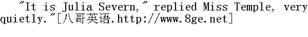 布罗克赫斯特先生说到这儿被打断了。另外三位来访者,都是女的,此刻进了房间。他们来得再早一点就好了,赶得上聆听他关于服饰的高论。她们穿着华丽,一身丝绒、绸缎和毛皮。二位中的两位年轻的(十六、七岁的漂亮姑娘)戴着当时十分时鳍一笑。多好的微笑!我至今还记得,而且知道,这是睿智和真正的勇气的流露,它像天使脸上的反光一样,照亮了她富有特征的面容、瘦削的脸庞和深陷的灰眼睛。然而就在那一刻,海伦.彭斯的胳膊上还佩戴着"不整洁标记";不到一小时之前我听见斯卡查德小姐罚她明天中饭只吃面包和清水,就因为她在抄写习题时弄脏了练习簿。人的天性就是这样的不完美!即使是最明亮的行星也有这类黑斑,而斯卡查德小姐这样的眼睛只能看到细微的缺陷,却对星球的万丈光芒视而不见。