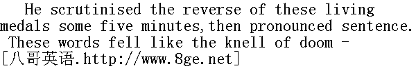 他把这些活奖章的背面细细打量了大约五分钟,随后宣布了判决,他的话如丧钟般响了起来: