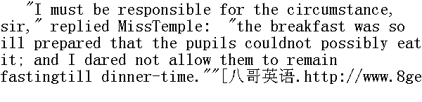 我必须对这一情况负责,先生,"坦普尔小姐回答说。"早饭烧得很糟糕,学生们都咽不下去。我不敢让她们一直饿看肚子到吃中饭。"