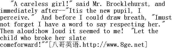 好粗心的姑娘!"布罗克赫斯特先生说,随后立刻又说,"是个新来的学生,我看出来了,"我还没喘过气来,他又说下去,"我可别忘了,有句关于她的话要说,"随后大着嗓门说。在我听来,那声音有多响啊!"让那个打破写字板的孩子到前面来!"