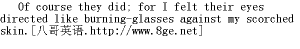 于是我就这么高高地站着。而我曾说过,我不能忍受双脚站立于房间正中的耻辱,但此刻我却站在耻辱台上示众。我的感触非语言所能形容。但是正当全体起立,使我呼吸困难,喉头紧缩的时候,一位姑娘走上前来,从我身边经过。她在走过时抬起了眼睛。那双眼睛闪着多么奇怪的光芒!那道光芒使我浑身充满了一种多么异乎寻常的感觉!这种新感觉给予我多大的支持!仿佛一位殉道者、一个英雄走过一个奴隶或者牺牲者的身边,刹那之间把力量也传给了他。我控制住了正待发作的歇斯底里,抬起头来,坚定地站在凳子上。海伦.彭斯问了史密斯小姐某个关于她作业的小问题,因为问题琐碎而被申斥了一通。她回到自己的位置上去时,再次走过我,对我微微一笑。多好的微笑!我至今还记得,而且知道,这是睿智和真正的勇气的流露,它像天使脸上的反光一样,照亮了她富有特征的面容、瘦削的脸庞和深陷的灰眼睛。然而就在那一刻,海伦.彭斯的胳膊上还佩戴着"不整洁标记";不到一小时之前我听见斯卡查德小姐罚她明天中饭只吃面包和清水,就因为她在抄写习题时弄脏了练习簿。人的天性就是这样的不完美!即使是最明亮的行星也有这类黑斑,而斯卡查德小姐这样的眼睛只能看到细微的缺陷,却对星球的万丈光芒视而不见。