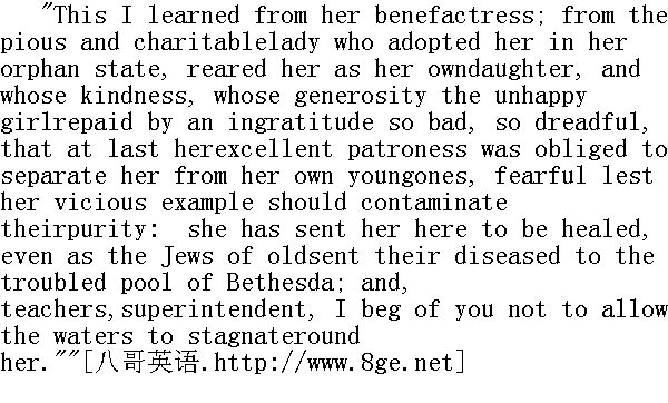 我是从她的恩人,一位廉诚慈善的太太那儿知道的。她成了孤儿的时候,是这位太太收养了她,把她作为亲生女儿来养育。这位不幸的姑娘竟以忘恩负义来报答她的善良和慷慨。这种行为那么恶劣,那么可怕,那位出色的恩主终于不得不把她同自己幼小的孩子们分开,生怕她的坏样子会沾污他们的纯洁。她被送到这里来治疗,就像古时的犹太人把病人送往毕士大搅动着的池水中一样。教师们,校长们,我请求你们不要让她周围成为一潭死水。"