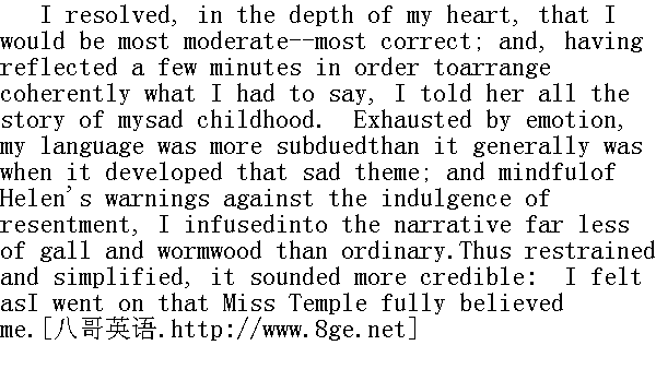 我暗下决心,要把话说得恰如其分,准确无误。我思考了几分钟,把该说的话理出了个头绪,便一五一十地向她诉说了我悲苦的童年。我己激动得精疲力尽,所以谈到这个伤心的话题时,说话比平时要克制。我还记住了海伦的告诫,不一味沉溺于怨词,叙述时所掺杂的刻薄与恼恨比往日少得多,而且态度收敛,内容简明,听来更加可信。我觉得,我往下说时,坦普尔小姐完全相信我的话。 In the course of the tale I had mentioned Mr. Lloyd as having cometo see me after the fit: for I never forgot the, to me, frightfulepisode of the red-room: in detailing which, my excitement wassure, in some degree, to break bounds; for nothing could soften inmy recollection the spasm of agony which clutched my heart when Mrs.Reed spurned my wild supplication for pardon, and locked me a secondtime in the dark and haunted chamber. 我在叙述自己的经历时,还提到了劳埃德先生,说他在我昏厥后来看过我。我永远忘不了可怕的红房子事件,有详细诉说时,我的情绪有点失态,因为当里德太太断然拒绝我发疯似的求饶,把我第二次关进黑洞洞闹鬼的房子时,那种阵阵揪心的痛苦,在记忆中是什么也抚慰不了的。 I had finished: Miss Temple regarded me a few minutes in silence;she then said - 我讲完了。坦普尔小姐默默地看了我几分钟,随后说: "I know something of Mr. Lloyd; I shall write to him; if his replyagrees with your statement, you shall be publicly cleared from everyimputation; to me, Jane, you are clear now."" 劳埃德先生我有些认识,我会写信给他的。要是他的答复同你说的相符,我们会公开澄清对你的诋毁。对我来说,简,现在你说的相符,我们会公开澄清对你的诋毁。对我来说,简,现在你已经清白了。" She kissed me, and still keeping me at her side (where I was wellcontented to stand, for I derived a child's pleasure from thecontemplation of her face, her dress, her one or two ornaments, herwhite forehead, her clustered and shining curls, and beaming darkeyes), she proceeded to address Helen Burns. 她吻了吻我,仍旧让我呆在她身边(我很乐意站在那里,因为我端详着她的面容、她的装束、她的一、二件饰品、她那白皙的额头、她那一团团闪光的卷发和乌黑发亮的眼睛时,得到了一种孩子般的喜悦)。她开始同海伦.彭斯说话了。