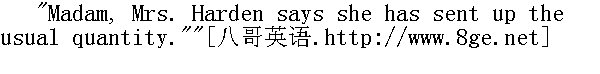 小姐,哈登太太说已经按平时的份量送来了。" Mrs. Harden, be it observed, was the housekeeper: a woman after Mr.Brocklehurst's own heart, made up of equal parts of whalebone andiron. 得说明一下,哈登太太是个管家,这个女人很合布罗克赫斯特先生的心意,两人的心一样都是铁铸的。 "Oh, very well!" returned Miss Temple; "we must make it do, Barbara,I suppose." And as the girl withdrew she added, smiling,"Fortunately, I have it in my power to supply deficiencies for thisonce."" 啊,好吧,"坦普尔小姐回答,"我想我们只好将就了,巴巴拉。"等这位姑娘一走,她便笑着补充说:"幸好我自己还能够弥补这次的欠缺。" Having invited Helen and me to approach the table, and placed beforeeach of us a cup of tea with one delicious but thin morsel of toast,she got up, unlocked a drawer, and taking from it a parcel wrappedin paper, disclosed presently to our eyes a good-sized seed-cake. 她邀海伦与我凑近桌子,在我们俩面前各放了一杯茶和一小片可口却很薄的烤面包,随后打开抽屉,从里面抽出一个纸包,我们眼前立刻出现了一个大果子饼。 "I meant to give each of you some of this to take with you," saidshe, "but as there is so little toast, you must have it now," andshe proceeded to cut slices with a generous hand." 我本想让你们各自带一点儿回去,"她说,"但是因为烤面包这么少,你们现在就得吃掉了。"她很大方地把饼切成了厚片。
