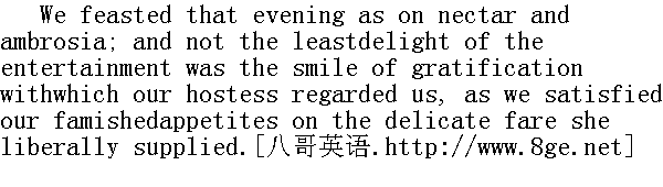那天夜晚,我们吃了香甜的饮料和食品,享受了一次盛宴。当她慷慨提供的美食,满足了我们的辘辘饥肠时,我们的女主人面带满意的微笑,望着我们,那笑容也一样令人愉快。 Tea over and the tray removed, she again summoned us to the fire; wesat one on each side of her, and now a conversation followed betweenher and Helen, which it was indeed a privilege to be admitted tohear. 吃完茶点,端走了托盘后,她又招呼我们到火炉边去。我们两人一边一个坐在她身旁。这时,她与海伦开始了谈话,而我能被允许旁听,实在也是有幸。 Miss Temple had always something of serenity in her air, of state inher mien, of refined propriety in her language, which precludeddeviation into the ardent, the excited, the eager: something whichchastened the pleasure of those who looked on her and listened toher, by a controlling sense of awe; and such was my feeling now:but as to Helen Burns, I was struck with wonder. 坦普尔小姐向来神态安详,风度庄重,谈吐文雅得体,这使她不至于陷入狂热、激奋和浮躁,同样也使看着她和倾听她的人,出于一种敬畏心情,不会露出过份的喜悦,这就是我此刻的情感。但海伦的情况却使我十分吃惊。 The refreshing meal, the brilliant fire, the presence and kindnessof her beloved instructress, or, perhaps, more than all these,something in her own unique mind, had roused her powers within her.They woke, they kindled: first, they glowed in the bright tint ofher cheek, which till this hour I had never seen but pale andbloodless; then they shone in the liquid lustre of her eyes, whichhad suddenly acquired a beauty more singular than that of MissTemple's--a beauty neither of fine colour nor long eyelash, norpencilled brow, but of meaning, of movement, of radiance. Then hersoul sat on her lips, and language flowed, from what source I cannottell. Has a girl of fourteen a heart large enough, vigorous enough,to hold the swelling spring of pure, full, fervid eloquence? Suchwas the characteristic of Helen's discourse on that, to me,memorable evening; her spirit seemed hastening to live within a verybrief span as much as many live during a protracted existence. 因为茶点振奋了精神,炉火在熊熊燃烧,因为亲爱的导师在场并待她很好,也许不止这一切,而是她独一无二的头脑中的某种东西,激发了她内在的种种力量。这些力量被唤醒了,被点燃了,起初闪烁在一向苍白而没有血色现在却容光焕发的脸上,随后显露在她水灵灵炯炯有神的眼睛里,这双眼睛突然之间获得了一种比坦普尔小姐的眼睛更为独特的美,它没有好看的色彩,没有长长的睫毛,没有用眉笔描过的眉毛,却那么意味深长,那么流动不息,那么光芒四射。随后她似乎心口交融,说话流畅。这些话从什么源头流出来,我无从判断。一个十四岁的女孩有这样活跃、这样宽大的胸怀,装得下这纯洁、充盈、炽热的雄辩之泉么?这就是那个使我难以忘怀的夜晚海伦谈话的特色。她的心灵仿佛急于要在短暂的片刻中,过得与众多长期苟活的人一样充实。 They conversed of things I had never heard of; of nations and timespast; of countries far away; of secrets of nature discovered orguessed at: they spoke of books: how many they had read! Whatstores of knowledge they possessed! Then they seemed so familiarwith French names and French authors: but my amazement reached itsclimax when Miss Temple asked Helen if she sometimes snatched amoment to recall the Latin her father had taught her, and taking abook from a shelf, bade her read and construe a page of Virgil; andHelen obeyed, my organ of veneration expanding at every soundingline. She had scarcely finished ere the bell announced bedtime! nodelay could be admitted; Miss Temple embraced us both, saying, asshe drew us to her heart - 她们谈论着我从未听说过的事情,谈到了逝去的民族和时代,谈到了遥远的国度;谈到了被发现或臆测到的自然界的奥秘,还谈到了书籍。她们看过的书真多啊!她们掌握的知识真丰富!随后她们似乎对法国人名和法国作者了如指掌。但最使我惊讶的是,这时坦普尔小姐问海伦是不是抽空在复习她爸爸教她的拉丁文,还从书架上取了一本书,吩咐她朗读和解释维吉尔①的一页著作,海伦照着做了。我每听一行朗朗的诗句,对她也就愈加肃然起敬。她几乎还没有读完,上床铃就响了,已不允许任何拖延。坦普尔小姐拥抱了我们俩,她把我们搂到怀里时说: