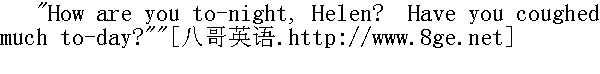 今晚你感觉怎么样,海伦?你今天咳得厉害吗?" "Not quite so much, I think, ma'am."" 我想不太厉害,小姐。" "And the pain in your chest?"" 胸部的疼痛呢?" "It is a little better."" 好一点了。" Miss Temple got up, took her hand and examined her pulse; then shereturned to her own seat: as she resumed it, I heard her sigh low.She was pensive a few minutes, then rousing herself, she saidcheerfully - 坦普尔小姐站起来,拉过她的手,按了按脉搏,随后回到了自己的座位上。坐定以后,我听她轻声叹了口气。她沉思了一会,随后回过神来,高兴地说: