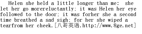 她拥抱海伦比拥抱我要长些,更不情愿放她走。她一直目送海伦到门边,为了海伦,她再次伤心地叹了口气;为了海伦,她从脸上抹去了一滴眼泪,