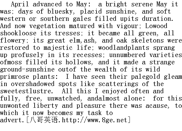 四月己逝,五月来临。这是一个明媚宁静的五月,日复一日,都是蔚蓝的天空,和煦的阳光,轻柔的西风和南风。现在,草木茁壮成长起来。罗沃德抖散了它的秀发,处处叶绿,遍地开花。榆树、岑树和橡树光秃秃的高大树干,恢复了生气勃勃的雄姿,林间植物在幽深处茂密生长,无数种类的苔鲜填补了林中的空谷。众多的野樱草花,就像奇妙地从地上升起的阳光。我在林荫深处曾见过它们淡谈的金色光芒,犹如点点散开的可爱光斑。这一切我常常尽情享受着,无拘无束,无人看管,而且几乎总是独自一人。这种自由与乐趣所以这么不同寻常,是有其原因的、而说清楚这个原委,就成了我现在的任务。