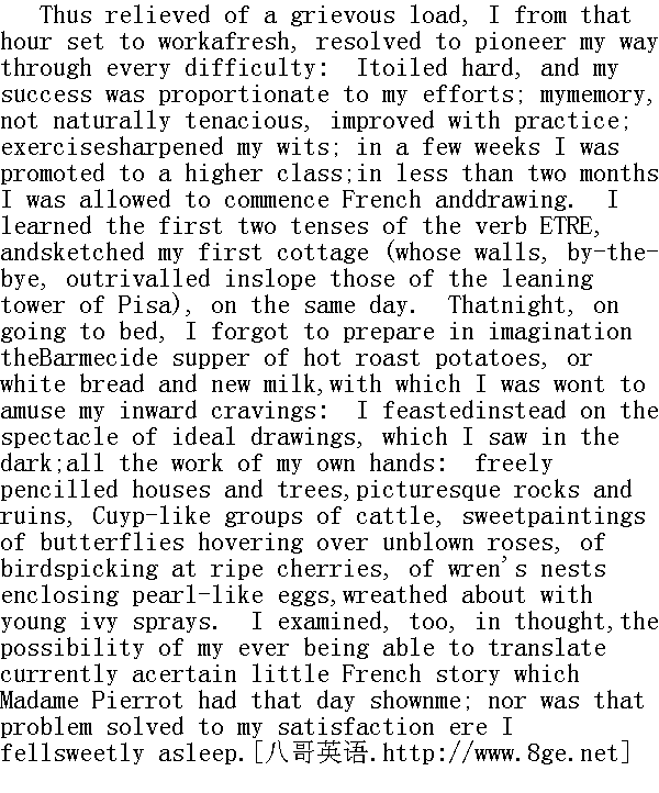 这样我便卸下了一个沉重的包袱。我打算从头努力,决心排除万难披荆斩棘地前进。我拼命苦干,付出几分努力,便获得几分成功。我的记忆力虽然不是生来很强,但经过实干有了改进,而反复练习使我的头脑更为机敏。几周之后,我被升到了高班,不到两个月我被允许学习法文和绘画。我学了动词Etre的最基本的两个时态;同一天我作了第一幅茅屋素描(顺便说一句,屋子墙壁的倾斜度可与比萨斜塔相媲美)。那天夜里上床时,我忘了在遐想中准备有热的烤土豆或白面包与新鲜牛奶的巴米赛德晚餐了,往常我是以此来解馋的。而现在,我在黑暗中所见到的理想画面成了我的盛宴。所有的画作都是出自我的手笔,潇洒自如的房屋、树木铅笔画,别致的岩石和废墟,克伊普式的牛群,以及各种可爱的画:有蝴蝶在含苞的玫瑰上翩翩起舞;有鸟儿啄着成熟的樱桃;有藏着珍珠般鸟蛋的鹪鹩巢穴,四周还绕着一圈嫩绿的长春藤。我还在脑子里掂量了一下,有没有可能把那天皮埃罗太太给我看的薄薄的法文故事书,流利地翻译出来。这个问题还没有满意解决,我便甜甜地睡着了。