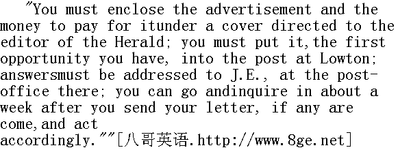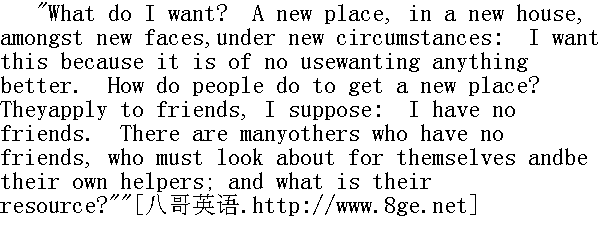 我需要什么呢?在新的环境、新的面孔、新的房子中一个新的工作。我只要这个,因为好高鹜远是徒劳无益的。人们怎样才能找到一个新工作呢?我猜想他们求助于朋友。但我没有朋友。很多没有朋友的人只好自己动手去找工作,自己救自己,他们采用什么办法呢?" I could not tell: nothing answered me; I then ordered my brain tofind a response, and quickly. It worked and worked faster: I feltthe pulses throb in my head and temples; but for nearly an hour itworked in chaos; and no result came of its efforts. Feverish withvain labour, I got up and took a turn in the room; undrew thecurtain, noted a star or two, shivered with cold, and again crept tobed. 我说不上来,找不到答案。随后我责令自己的头脑找到一个回答,而且要快。我动着脑筋,越动越快。我感到我的脑袋和太阳穴在搏动着。但将近一个小时,我的脑子乱七八糟,一切努力毫无结果。我因为徒劳无功而心乱加麻,便立起身来,在房间里转了转,拉开窗帘,望见一两颗星星,在寒夜中颤抖,我再次爬到床上。 A kind fairy, in my absence, had surely dropped the requiredsuggestion on my pillow; for as I lay down, it came quietly andnaturally to my mind.--"Those who want situations advertise; youmust advertise in the -shire Herald." 准是有一位善良的仙女,趁我不在时把我需要的主意放到了我枕头上,因为我躺下时,这主意悄悄地、自然而然地闪入我脑际。"凡是谋职的人都登广告,你必须在《××郡先驱报》上登广告。" "How? I know nothing about advertising."" 怎么登呢?我对广告一无所知。" Replies rose smooth and prompt now:- 回答来得自然而又及时: