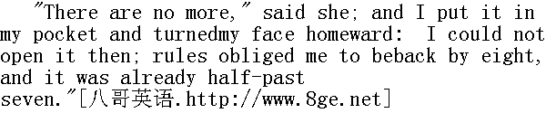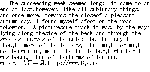 接着的那个星期似乎很长,然而,它像世间的万物一样,终于到了尽头。一个秋高气爽的傍晚,我再次踏上了去洛顿的路途。顺便提一句,小路风景如画,沿着小溪向前延伸,穿过弯弯曲曲秀色诱人的山谷。不过那天我想得更多的是那封可能在,可能不在小城等着我的信,而不是草地和溪水的魅力。 My ostensible errand on this occasion was to get measured for a pairof shoes; so I discharged that business first, and when it was done,I stepped across the clean and quiet little street from theshoemaker's to the post-office: it was kept by an old dame, whowore horn spectacles on her nose, and black mittens on her hands. 这时我冠冕堂皇的差使是度量脚码做一双鞋。所以我先去干这件事。了却以后,从鞋匠那儿出来,穿过洁净安宁的小街,来到邮局。管理员是位老妇人,鼻梁上架着角质眼镜,手上戴着黑色露指手套。 "Are there any letters for J.E.?" I asked." 有写给J.E.的信吗?"我问。 She peered at me over her spectacles, and then she opened a drawerand fumbled among its contents for a long time, so long that myhopes began to falter. At last, having held a document before herglasses for nearly five minutes, she presented it across thecounter, accompanying the act by another inquisitive and mistrustfulglance--it was for J.E. 她从眼镜上方盯着我,随后打开一个抽屉,在里面放着的东西中间翻了好久好久。时间那么长,我简直开始有些泄气了。最后,她终于把一份文件放到眼镜底上,过了将近五分钟,才越过柜台,递给我,同时投过来刨根究底,疑虑重重的一瞥--这封信是写给J.E.的。 "Is there only one?" I demanded." 就只有这么一封?"我问。