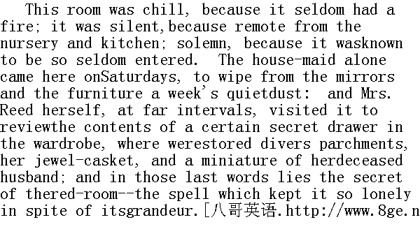 房子里难得生火,所以很冷;因为远离保育室和厨房,所以很静;又因为谁都知道很少有人进去,所以显得庄严肃穆。只有女佣每逢星期六上这里来,把一周内静悄悄落在镜子上和家具上的灰尘抹去。还有里德太太本人,隔好久才来一次,查看大橱里某个秘密抽屉里的东西。这里存放着各类羊皮文件,她的首饰盒,以及她已故丈夫的肖像。上面提到的最后几句话,给红房子带来了一种神秘感,一种魔力,因而它虽然富丽堂皇,却显得分外凄清。