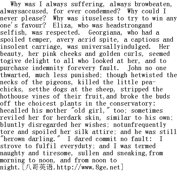 为什么我总是受苦,总是遭人白眼,总是让人告状,永远受到责备呢?为什么我永远不能讨人喜欢?为什么我尽力博取欢心,却依然无济于事呢?伊丽莎自私任性,却受到尊敬;乔治亚娜好使性子,心肠又毒,而且强词夺理目空一切,偏偏得到所有人的纵容。她的美貌,她红润的面颊,金色的卷发,使得她人见人爱,一俊便可遮百丑。至于约翰,没有人同他顶撞,更不用说教训他了,虽然他什么坏事都干:捻断鸽子的头颈,弄死小孔雀,放狗去咬羊,采摘温室中的葡萄,掐断暖房上等花木的嫩芽。有时还叫他母亲"老姑娘",又因为她皮肤黝黑像他自己而破口大骂。他蛮横地与母亲作对,经常撕毁她的丝绸服装,而他却依然是"她的宝贝蛋"。而我不敢有丝毫闪失,干什么都全力以赴,人家还是骂我淘气鬼,讨厌坯,骂我阴丝丝,贼溜溜,从早上骂到下午,从下午骂到晚上。