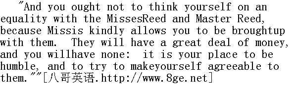 你不能因为太太好心把你同里德小姐和少爷一块抚养大,就以为自己与他们平等了。他们将来会有很多很多钱,而你却一个子儿也不会有。你得学谦恭些,尽量顺着他们,这才是你的本份。"