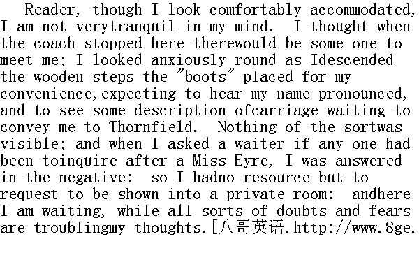 读者,我虽然看来安顿得舒舒服服,但内心却并不平静,我以为车子一停就会有人来接我。从脚夫为我方便而搭的木板上走下来时,我焦急地四顾,盼着听到有人叫我的名字,希望看到有辆马车等候着把我送往桑菲尔德。然而却不见这类动静。我问一位侍者是否有人来探问过一个爱小姐,得到的回答是没有。我无可奈何地请他们把我领到一间僻静的房间,一面等待着,一面疑窦丛生,愁肠百结,心里十分不安。