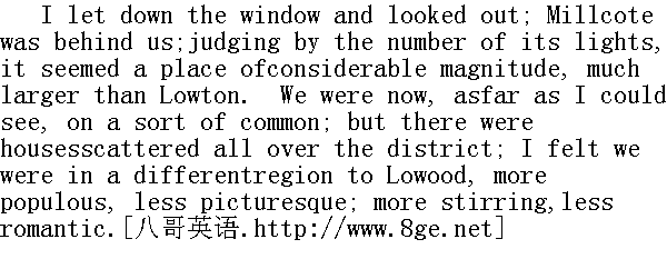 我放下窗子,往外盼望。米尔科特已落在我们身后。从灯光的数量来看,这似乎是一个相当大的城市,比洛顿要大得多。就我所知,我们此刻像是在一块公地上,不过屋宇遍布整个地区。我觉得我们所在的地区与罗沃德不同。人口更为稠密,却并不那么景色如画;更加熙熙攘攘,却不那么浪漫。