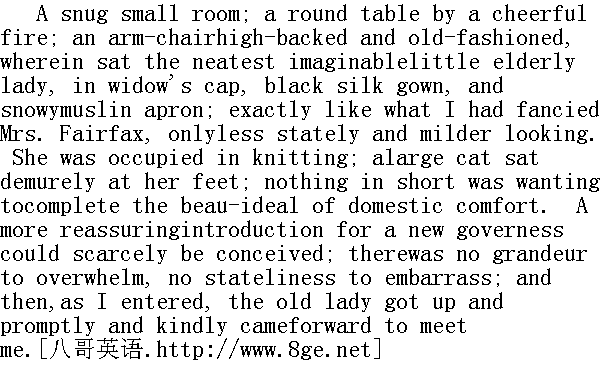 这是一个舒适的小房间,温暖的炉火旁摆着一张圆桌,一条老式高背安乐椅上,坐着一位整洁不过的矮小老妇人,头戴寡妇帽,身穿黑色丝绸长袍,还围着雪白的平纹细布围裙,跟我想象中的费尔法克斯太太一模一样,只是不那么威严,却显得更加和蔼罢了。她正忙着编织。一只硕大的猫娴静地蹲在她脚边。作为一幅理想的家庭闲适图,它真是完美无缺了。对一个新到的家庭女教师来说,也很难设想有比这更让人放心的初次见面的情景了。没有那种咄咄逼人的豪华,也没有今人难堪的庄严。我一进门,那老妇人便站了起来,立刻客客气气地上前来迎接我。