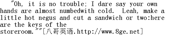 啊,一点也不麻烦。你的手恐怕差点儿冻僵了吧。莉娅,调点儿尼格斯酒,切一两片三明治。储藏室的钥匙在这儿。"