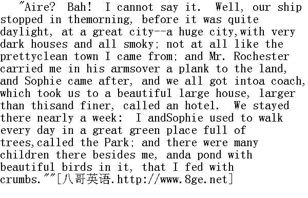 埃尔?啊,我说不上来。是呀,我们的船在早晨停了下来,天还没有大亮,船在一个大城市靠了岸,一个很大的城市,房子都很黑,全都冒着烟。一点也不像我原来地方漂亮干净的城镇。罗切斯特先生抱着我走过一块板,来到陆地上,索菲娅跟在后面,我们坐进了一辆马车,它把我们带到了一座美丽的大房子,比这座还要大,还要好,叫做旅馆。我们在那里呆了差不多一个星期,我和索菲娅每天去逛一个老大的地方,种满了树,碧绿碧绿的,他们管它叫公园。除了我,那里还有很多孩子,还有一个池塘,池塘里有很多漂亮的鸟,我用面包屑喂它们。" "Can you understand her when she runs on so fast?" asked Mrs.Fairfax." 她讲得那么快,你能听懂吗?"费尔法克斯太太问。 I understood her very well, for I had been accustomed to the fluenttongue of Madame Pierrot. 我完全懂她的话,因为过去早已听惯了皮埃罗夫人流利的语言。 "I wish," continued the good lady, "you would ask her a question ortwo about her parents: I wonder if she remembers them?"" 我希望,"这位善良的夫人继续说,"你问她一两个关于她父母的问题,看她还记不记得他们。 "Adele," I inquired, "with whom did you live when you were in thatpretty clean town you spoke of?"" 阿黛勒,"我问,"在你说的那个既漂亮又干净的镇上,你跟谁一起过日子的?"