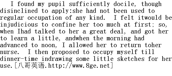 这首诗是你妈妈教你的么?"我问。 "Yes, and she just used to say it in this way: 'Qu' avez vous donc?lui dit un de ces rats; parlez!' She made me lift my hand--so--toremind me to raise my voice at the question. Now shall I dance foryou?"" 是的,她总是这么说'Qu' avez vous donc? Lui dit un de ces rats;parlez!'她要我把手举起来,这样,提醒我读问题的时候要提高嗓门儿。现在我来跳舞给你看好吗?" "No, that will do: but after your mama went to the Holy Virgin, asyou say, with whom did you live then?"" 不,行啦。你妈妈到圣母玛丽亚那儿去了后,你跟谁一块儿住呢?" "With Madame Frederic and her husband: she took care of me, but sheis nothing related to me. I think she is poor, for she had not sofine a house as mama. I was not long there. Mr. Rochester asked meif I would like to go and live with him in England, and I said yes;for I knew Mr. Rochester before I knew Madame Frederic, and he wasalways kind to me and gave me pretty dresses and toys: but you seehe has not kept his word, for he has brought me to England, and nowhe is gone back again himself, and I never see him."" 同弗雷德里克太太和她的丈夫。她照顾我,不过她跟我没有亲戚关系。我想她很穷,因为她不像妈妈那样有好房子。我在那里没呆多久。罗切斯特先生问我,是否愿意同他一起住到英国去。我说好的,因为我认得弗雷德里克太太之前就认得罗切斯特先生了。他总是待我很好,送我漂亮的衣服和玩具,可是你瞧他说话不算数,把我带到了英国,自己倒又回去了,我从来没有见过他。" After breakfast, Adele and I withdrew to the library, which room, itappears, Mr. Rochester had directed should be used as theschoolroom. Most of the books were locked up behind glass doors;but there was one bookcase left open containing everything thatcould be needed in the way of elementary works, and several volumesof light literature, poetry, biography, travels, a few romances, &c.I suppose he had considered that these were all the governess wouldrequire for her private perusal; and, indeed, they contented meamply for the present; compared with the scanty pickings I had nowand then been able to glean at Lowood, they seemed to offer anabundant harvest of entertainment and information. In this room,too, there was a cabinet piano, quite new and of superior tone; alsoan easel for painting and a pair of globes. 吃了早饭,阿黛勒和我进了图书室。罗切斯特先生好像曾吩咐把这用作教室。大部分书籍都锁在玻璃门内,但有一个书架却是敞开的,上面摆着基础教育所需要的各类书籍,和几部轻松的文学作品、诗歌、传记、游记和一些传奇故事等。我猜想这些就是他认为家庭女教师自个儿想看的书。的确,有这些书眼下我已经心满意足。同罗沃德书苑偶尔的少量采摘相比,这里所奉献的却是知识和娱乐的大丰收了。在房子里还有一架小巧的钢琴,成 色很新,音调优美。此外,还有一个画架和一对地球仪。