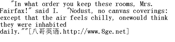 这些房间收拾得多整齐呀,费尔法克斯太太!"我说。"没有帆布罩子,却能做到纤尘不染,要不是空气冷飕飕的,人家准以为天天住着人呢。"