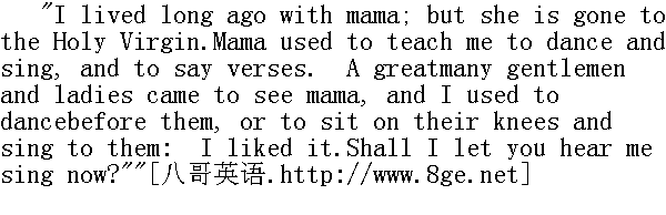 很久以前我跟妈妈住在一起,可是她到圣母玛丽娅那儿去了。妈妈过去常教我跳舞、唱歌、朗诵诗歌。很多很多先生和太太来看妈妈,我老是跳舞给他们看,或者坐在他们膝头上,唱歌给他们听。我喜欢这样,让我现在唱给你听好吗?" She had finished her breakfast, so I permitted her to give aspecimen of her accomplishments. Descending from her chair, shecame and placed herself on my knee; then, folding her little handsdemurely before her, shaking back her curls and lifting her eyes tothe ceiling, she commenced singing a song from some opera. It wasthe strain of a forsaken lady, who, after bewailing the perfidy ofher lover, calls pride to her aid; desires her attendant to deck herin her brightest jewels and richest robes, and resolves to meet thefalse one that night at a ball, and prove to him, by the gaiety ofher demeanour, how little his desertion has affected her. 她已吃了早饭,所以我允许她露一手。她从椅子上下来,走到我面前,坐上我膝头。接着,一本正经地抱着双臂,把卷发往身后一甩,抬眼望着天花板,开始唱起了某出歌剧中的一个曲子。说的是一个被遗弃的女人,对情人的绝情痛苦了一番之后,求助于自己的自尊,要她的侍者用最耀眼的首饰和最华丽的礼服,把她打扮起来,决定在当晚的一个舞会上同那个负心汉见面,以自己欢快的举止向他证明,她并没有因为被遗弃而感到蒙受了什么打击。 The subject seemed strangely chosen for an infant singer; but Isuppose the point of the exhibition lay in hearing the notes of loveand jealousy warbled with the lisp of childhood; and in very badtaste that point was: at least I thought so. 给一位儿童歌手选择这样的题材,似乎有些离奇。不过我猜想,要她表演目的在于听听用童声唱出来的爱情和嫉妒的曲调。但那目的本身就是低级趣味的,至少我这样想。 Adele sang the canzonette tunefully enough, and with the naivete ofher age. This achieved, she jumped from my knee and said, "Now, Mademoiselle, I will repeat you some poetry." 阿黛勒把这支歌唱得悦耳动听,而且还带着她那种年纪会有的天真烂漫的情调。唱完以后,她从我膝头跳下说:"小姐,现在我来给你朗诵些诗吧。" Assuming an attitude, she began, "La Ligue des Rats: fable de LaFontaine." She then declaimed the little piece with an attention topunctuation and emphasis, a flexibility of voice and anappropriateness of gesture, very unusual indeed at her age, andwhich proved she had been carefully trained. 她摆好姿势,先报了题目:"La ligue des Rats, fable de La Fontaine",随后她朗诵了这首短诗,十分讲究抑扬顿挫,声调婉转,动作得体,在她这个年纪,实在是很不寻常了,说明她受过悉心的训练。