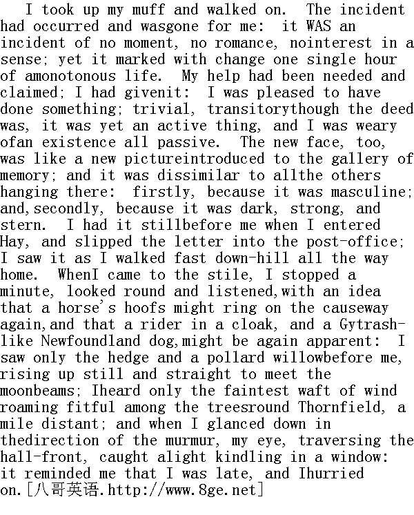 我拾起皮手筒继续赶路,对我来说、这件事已经发生,并已成为过去。在某种程度上说,它既不重要,也不浪漫,又不有趣。但它却标志着单调乏味的生活有了一个小时的变化。人家需要我的帮助,而且求了我,而我给予了帮助。我很高兴总算干了点什么。这件事尽管微不足道,稍纵即逝,但毕竟是积极的,而我对被动的生活方式已感到厌倦。这张新面孔犹如一幅新画,被送进了记忆的画廊,它同已经张贴着的画全然不同。第一,因为这是位男性;第二,他又黑又强壮、又严厉。我进了海村把信投入邮局的时候,这幅画仍浮现在我眼前。我迅步下山一路赶回家时,也依然看到它。我路过台阶时驻足片刻,举目四顾,并静听着。心想马蹄声会再次在小路上回响,一位身披斗篷的骑手,一条盖特拉西似的纽芬兰狗会重新出现在眼前。但我只看到树篱和面前一棵没有枝梢的柳树,静静地兀立着,迎接月亮的清辉;我只听到一阵微风,在一英里开外,绕着桑菲尔德府的树林时起时落;当我朝轻风拂拂的方向俯视时,我的目光扫过府楼正面,看到了一个窗户里亮着灯光,提醒我时候已经不早。我匆匆往前走去。 I did not like re-entering Thornfield. To pass its threshold was toreturn to stagnation; to cross the silent hall, to ascend thedarksome staircase, to seek my own lonely little room, and then tomeet tranquil Mrs. Fairfax, and spend the long winter evening withher, and her only, was to quell wholly the faint excitement wakenedby my walk,--to slip again over my faculties the viewless fetters ofan uniform and too still existence; of an existence whose veryprivileges of security and ease I was becoming incapable ofappreciating. What good it would have done me at that time to havebeen tossed in the storms of an uncertain struggling life, and tohave been taught by rough and bitter experience to long for the calmamidst which I now repined! Yes, just as much good as it would do aman tired of sitting still in a "too easy chair" to take a longwalk: and just as natural was the wish to stir, under mycircumstances, as it would be under his. 我不情愿再次跨进桑菲尔德府。踏进门槛就意味着回到了一潭死水之中,穿过寂静的大厅,登上暗洞洞的楼梯,寻找我那孤寂的小房间,然后去见心如古井的费尔法克斯太太,同她,只同她度过漫长的冬夜,这一切将彻底浇灭我这回步行所激起的兴奋,重又用一成不变的静止生活的无形镣铐,锁住我自己的感官。这种生活的稳定安逸的长处,我已难以欣赏。那时候要是我被抛掷到朝不虑夕、苦苦挣扎的生活风暴中去,要是艰难痛苦的经历,能启发我去向往我现在所深感不满的宁静生活,对我会有多大的教益呀!是呀,它的好处大可以与远距离散步对在"超等安乐椅"上坐累了的人的好处相媲美。在我现在这种情况下,希望走动走动,跟他在那种情况希望走动一样,是很自然的事。 I lingered at the gates; I lingered on the lawn; I paced backwardsand forwards on the pavement; the shutters of the glass door wereclosed; I could not see into the interior; and both my eyes andspirit seemed drawn from the gloomy house--from the grey-hollowfilled with rayless cells, as it appeared to me--to that skyexpanded before me,--a blue sea absolved from taint of cloud; themoon ascending it in solemn march; her orb seeming to look up as sheleft the hill-tops, from behind which she had come, far and fartherbelow her, and aspired to the zenith, midnight dark in itsfathomless depth and measureless distance; and for those tremblingstars that followed her course; they made my heart tremble, my veinsglow when I viewed them. Little things recall us to earth; theclock struck in the hall; that sufficed; I turned from moon andstars, opened a side-door, and went in. 我在门口徘徊,我在草坪上徘徊,我在人行道上来回踱步。玻璃门上的百叶窗己经关上,我看不见窗子里面的东西。我的目光与心灵似乎已从那幢阴暗的房子,从在我看来是满布暗室的灰色洞穴中,退缩出来,到达了展现在我面前的天空--一片云影全无的蓝色海洋。月亮庄严地大步迈向天空,离开原先躲藏的山顶背后,将山峦远远地抛在下面,仿佛还在翘首仰望,一心要到达黑如子夜、深远莫测的天顶。那些闪烁着的繁星尾随其后,我望着它们不觉心儿打颤,热血沸腾。一些小事往往又把我们拉回人间。大厅里的钟己经敲响,这就够了。我从月亮和星星那儿掉过头来,打开边门,走了进去。 The hall was not dark, nor yet was it lit, only by the high-hungbronze lamp; a warm glow suffused both it and the lower steps of theoak staircase. This ruddy shine issued from the great dining-room,whose two-leaved door stood open, and showed a genial fire in thegrate, glancing on marble hearth and brass fire-irons, and revealingpurple draperies and polished furniture, in the most pleasantradiance. It revealed, too, a group near the mantelpiece: I hadscarcely caught it, and scarcely become aware of a cheerful minglingof voices, amongst which I seemed to distinguish the tones of Adele,when the door closed. 大厅还没有暗下来,厅里独一无二、高悬着的铜灯也没有点亮。暖融融的火光,映照着大厅和橡树楼梯最低几级踏阶。这红光是从大餐厅里射出来的,那里的两扇门开着。只见温暖宜人的炉火映出了大理石炉板和铜制的炉具,并把紫色的帐幔和上了光的家具照得辉煌悦目。炉火也映出了壁炉边的一群人,但因为关着门,我几乎没能看清楚他们,也没有听清楚欢乐而嘈杂的人声,不过阿黛勒的口音,似乎还能分辩得出来。 I hastened to Mrs. Fairfax's room; there was a fire there too, butno candle, and no Mrs. Fairfax. Instead, all alone, s