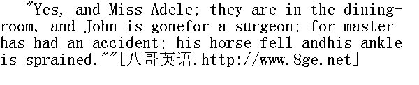 是的,还有阿黛勒小姐。他们都在餐室,约翰已去叫医生了。老爷出了一个事故,他的马倒下了,他扭伤了脚踝。" "Did the horse fall in Hay Lane?"" 那匹马是在海路上倒下的吗?" "Yes, coming down-hill; it slipped on some ice."" 是呀,下山的时候,在冰上滑了一下。" "Ah! Bring me a candle will you Leah?"" 啊!给我一支蜡烛好吗,莉娅?" Leah brought it; she entered, followed by Mrs. Fairfax, who repeatedthe news; adding that Mr. Carter the surgeon was come, and was nowwith Mr. Rochester: then she hurried out to give orders about tea,and I went upstairs to take off my things. 莉娅把蜡烛送来了,进门时后面跟着费尔法克斯太太,她把刚才的新闻重复了一遍,还说外科医生卡特已经来了,这会儿同罗切斯特先生在一起。说完便匆勿走出去吩咐上茶点,而我则上楼去脱外出时的衣装。