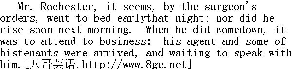遵照医嘱,罗切斯特先生那晚上床很早,第二天早晨也没有马上起身。他就是下楼来也是处理事务的,他的代理人和一些佃户到了,等着要跟他说话。 Adele and I had now to vacate the library: it would be in dailyrequisition as a reception-room for callers. A fire was lit in anapartment upstairs, and there I carried our books, and arranged itfor the future schoolroom. I discerned in the course of the morningthat Thornfield Hall was a changed place: no longer silent as achurch, it echoed every hour or two to a knock at the door, or aclang of the bell; steps, too, often traversed the hall, and newvoices spoke in different keys below; a rill from the outer worldwas flowing through it; it had a master: for my part, I liked itbetter. 阿黛勒和我现在得腾出书房,用作每日来访者的接待室。楼上的一个房间生起了火,我把书搬到那里,把它辟为未来的读书室。早上我觉察到桑菲尔德变了样,不再像教堂那么沉寂,每隔一两个小时便回响起敲门声或拉铃声,常有脚步声越过大厅,不同声调的陌生话音也在楼下响起,一条潺潺溪流从外面世界流进了府里,因为府上有了个主人。就我来说,倒更喜欢这样。 Adele was not easy to teach that day; she could not apply: she keptrunning to the door and looking over the banisters to see if shecould get a glimpse of Mr. Rochester; then she coined pretexts to godownstairs, in order, as I shrewdly suspected, to visit the library,where I knew she was not wanted; then, when I got a little angry,and made her sit still, she continued to talk incessantly of her"ami, Monsieur Edouard Fairfax DE Rochester," as she dubbed him (Ihad not before heard his prenomens), and to conjecture what presentshe had brought her: for it appears he had intimated the nightbefore, that when his luggage came from Millcote, there would befound amongst it a little box in whose contents she had an interest. 那天阿黛勒不大好教。她静不下心来,不往往门边跑,从栏杆上往下张望,看看能不能瞧一眼罗切斯特先生。随后编造出一些借口来,要到楼下去,我一下就猜到是为了到书房去走走,我知道那儿并不需要她。随后,见我有点儿生气了,并让她好好儿坐着,她就不断唠叨起她的"Ami,Monsieur Edouard Fairfax deRochester",她就这么称呼他(而我以前从末听到过他的教名),还想象着他给她带来了什么礼物。因为他似乎在前天晚上提起过,他的行李从米尔科特运到后,内中会有一个小匣子,匣子里的东西她很感兴趣。 "Et cela doit signifier," said she, "qu'il y aura le dedans uncadeau pour moi, et peut-etre pour vous aussi, mademoiselle.Monsieur a parle de vous: il m'a demande le nom de ma gouvernante,et si elle n'etait pas une petite personne, assez mince et un peupale. J'ai dit qu'oui: car c'est vrai, n'est-ce pas,mademoiselle?"I and my pupil dined as usual in Mrs. Fairfax's parlour; theafternoon was wild and snowy, and we passed it in the schoolroom.At dark I allowed Adele to put away books and work, and to rundownstairs; for, from the comparative silence below, and from thecessation of appeals to the door-bell, I conjectured that Mr.Rochester was now at liberty. Left alone, I walked to the window;but nothing was to be seen thence: twilight and snowflakes togetherthickened the air, and hid the very shrubs on the lawn. I let downthe curtain and went back to the fireside."Et cela doit signifier," 她说"qu'il y aura la dedans un cadeau pour moi, et peut etre pour vous aussi Mademoiselle. Monsienr a parle de vous: il m'a demande le nom de ma "坐到火炉边来,"这位主人说。这时托盘己经端走,费尔法克斯太太躲进角落忙着编织,阿黛勒拉住我的手在房间里打转,把她放在架子和柜子上的漂亮的书籍和饰品拿给我看,我们义不容辞地服从了。阿黛勒想坐在我膝头上,却被吩咐去逗派洛特玩了午风雪交加,我们呆在读书室 里。天黑时我允许阿黛勒放下书和作业,奔到楼下去,因为下面已比较安静,门铃声也已消 停,想必罗切斯特先生此刻有空了。房间里只剩下了我一个人,我便走到窗子跟前,但那儿 什么也看不见。暮色和雪片使空气混混沌沌,连草坪上的灌木也看不清楚了。我放下窗帘, 回到了火炉边。