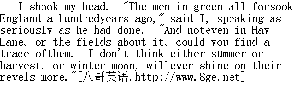 我摇了摇头。"绿衣仙人几百年前就离开了英格兰,"我也像他一样一本正经地说,"就是在海路上或者附近的田野,你也见不到他们的一丝踪迹。我想夏天、秋夜或者冬季的月亮再也不会照耀他们的狂欢了。"