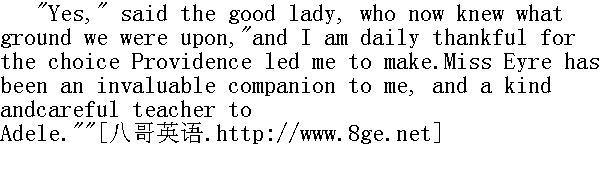是的,"这位好心的太太说,此刻她才弄明白我们谈话的立足点。"我每天感谢主引导我作出了这个选择。爱小姐对我是个不可多得的伙伴,对阿黛勒是位和气细心的教师。"
