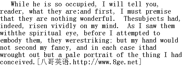 趁他看画的时候,读者,我要告诉你,那是些什么画。首先我得事先声明,它们并没有什么了不起。画的题材倒确实活脱脱地浮现在我脑海里。我还没有想用画来表现时,它们就已在我心灵的目光下显得栩栩如生。然而在落笔时,我的手却不听我想象的使唤,每次都只能给想象中的东西勾勒出一个苍白无力的图象来。 These pictures were in water-colours. The first represented cloudslow and livid, rolling over a swollen sea: all the distance was ineclipse; so, too, was the foreground; or rather, the nearestbillows, for there was no land. One gleam of light lifted intorelief a half-submerged mast, on which sat a cormorant, dark andlarge, with wings flecked with foam; its beak held a gold braceletset with gems, that I had touched with as brilliant tints as mypalette could yield, and as glittering distinctness as my pencilcould impart. Sinking below the bird and mast, a drowned corpseglanced through the green water; a fair arm was the only limbclearly visible, whence the bracelet had been washed or torn. 这些都是水彩画。第一张画的是,低垂的铅色云块,在波涛汹涌的海面上翻滚,远处的一切黯然无光,画面的前景也是如此,或者不如说,靠得最近的波涛是这样,因为画中没高陆地。-束微光把半沉的桅杆映照得轮廓分明,桅杆上栖息着一只又黑又大的鸬鹚,翅膀上沾着斑驳的泡沫,嘴里衔着一只镶嵌了宝石的金手镯,我给手镯抹上了调色板所能调出的最明亮的色泽,以及我的铅笔所能勾划出的闪闪金光。在鸟和桅杆下面的碧波里,隐约可见一具沉溺的尸体,它身上唯一看得清清楚楚的肢体是一只美丽的胳膊,那手镯就是从这里被水冲走或是给鸟儿啄下来的。 The second picture contained for foreground only the dim peak of ahill, with grass and some leaves slanting as if by a breeze. Beyondand above spread an expanse of sky, dark blue as at twilight:rising into the sky was a woman's shape to the bust, portrayed intints as dusk and soft as I could combine. The dim forehead wascrowned with a star; the lineaments below were seen as through thesuffusion of vapour; the eyes shone dark and wild; the hair streamedshadowy, like a beamless cloud torn by storm or by electric travail.On the neck lay a pale reflection like moonlight; the same faintlustre touched the train of thin clouds from which rose and bowedthis vision of the Evening Star. 第二张画的前景只有一座朦胧的山峰,青草和树叶似乎被微风吹歪了。在远处和上方铺开了一片薄暮时分深蓝色的浩瀚天空。一个女人的半身形体高耸天际,色调被我尽力点染得柔和与暗淡。模糊的额头上点缀着一颗星星,下面的脸部仿佛透现在雾气蒸腾之中。双目乌黑狂野、炯炯有神。头发如阴影一般飘洒,仿佛是被风爆和闪电撕下的暗淡无光的云块。脖子上有一抹宛若月色的淡淡反光,一片片薄云也有着同样浅色的光泽,云端里升起了低着头的金星的幻象。