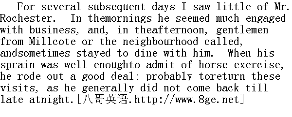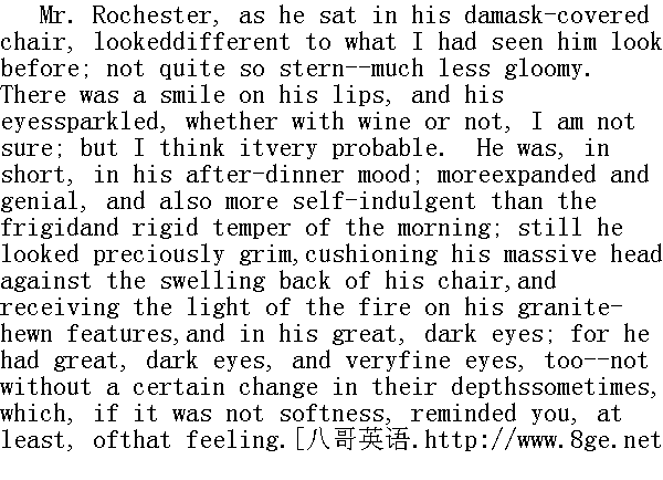罗切斯特先生坐在锦缎面椅子上,显得同我以前看到的大不相同,不那么严厉,更不那么阴沉。他嘴上浮着笑容,眼睛闪闪发光,是不是因为喝了酒的缘故,我不敢肯定,不过很可能如此。总之,他正在饭后的兴头上,更加健谈,更加亲切,比之早上冷淡僵硬的脾性,显得更为放纵。不过他看上去依然十分严厉。他那硕大的脑袋靠在椅子隆起的靠背上,炉火的光照在他犹如花岗岩镌刻出来的面容上,照进他又大又黑的眸子里--因为他有着 一双乌黑的大眼睛,而且很漂亮,有时在眼睛深处也并非没有某种变化,如果那不是柔情,至少也会使你想起这种感情来。 He had been looking two minutes at the fire, and I had been lookingthe same length of time at him, when, turning suddenly, he caught mygaze fastened on his physiognomy. 他凝视着炉火已经有两分钟了,而我用同样的时间在打量着他。突然他回过头来,瞧见我正盯着他的脸看着。 "You examine me, Miss Eyre," said he: "do you think me handsome?"" 你在仔细看我,爱小姐,"他说,"你认为我长得漂亮吗?" I should, if I had deliberated, have replied to this question bysomething conventionally vague and polite; but the answer somehowslipped from my tongue before I was aware--"No, sir." 要是我仔细考虑的话,我本应当对这个问题作出习惯上含糊、礼貌的回答,但不知怎地我还没意识到就己经冲口而出:"不,先生。" "Ah! By my word! there is something singular about you," said he:"you have the air of a little nonnette; quaint, quiet, grave, andsimple, as you sit with your hands before you, and your eyesgenerally bent on the carpet (except, by-the-bye, when they aredirected piercingly to my face; as just now, for instance); and whenone asks you a question, or makes a remark to which you are obligedto reply, you rap out a round rejoinder, which, if not blunt, is atleast brusque. What do you mean by it?"" 啊!我敢打赌,你这人有点儿特别,"他说,"你的神态像个小nonnette,怪僻、文静、严肃、单纯。你坐着的时候把手放在面前,眼睛总是低垂着看地毯(顺便说一句,除了穿心透肺似地扫向我脸庞的时候,譬如像刚才那样),别人问你一个问题,或者发表一番你必须回答的看法时,你会突然直言不讳地回答,不是生硬,就是唐突。你的话是什么意思?"