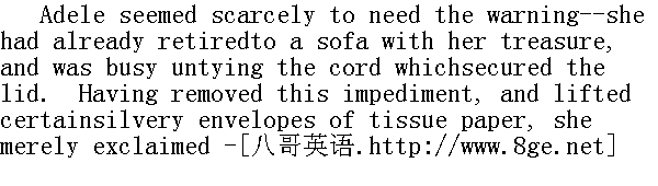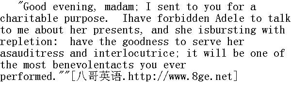 晚上好,夫人,我请你来做件好事。我己不允许阿黛勒跟我谈礼品的事,她肚子里有好多话要说,你做做好事听她讲讲,并跟她谈谈,那你就功德无量了。" Adele, indeed, no sooner saw Mrs. Fairfax, than she summoned her toher sofa, and there quickly filled her lap with the porcelain, theivory, the waxen contents of her "boite;" pouring out, meantime,explanations and raptures in such broken English as she was mistressof. 说真的,阿黛勒一见到费尔法克斯太太,便把她叫到沙发旁,很快在她的膝头摆满了她'boite'中的瓷器、象牙和蜡制品,同时用她所能掌握的瞥脚英语,不住地加以解释,告诉她自己有多开心。 "Now I have performed the part of a good host," pursued Mr.Rochester, "put my guests into the way of amusing each other, Iought to be at liberty to attend to my own pleasure. Miss Eyre,draw your chair still a little farther forward: you are yet too farback; I cannot see you without disturbing my position in thiscomfortable chair, which I have no mind to do."" 哈,我已扮演了一个好主人的角色,"罗切斯特先生继续说,"使我的客人们各得其所,彼此都有乐趣。我应当有权关心一下自己的乐趣了。爱小姐,把你的椅子再往前拉一点,你坐得太靠后了,我在这把舒舒服服的椅子上,不改变一下位置就看不见你,而我又不想动。" I did as I was bid, though I would much rather have remainedsomewhat in the shade; but Mr. Rochester had such a direct way ofgiving orders, it seemed a matter of course to obey him promptly. 我照他的吩咐做了,尽管我宁愿仍旧呆在阴影里。但罗切斯特先生却是那么直来直去地下命令,似乎立刻服从他是理所当然的。 We were, as I have said, in the dining-room: the lustre, which hadbeen lit for dinner, filled the room with a festal breadth of light;the large fire was all red and clear; the purple curtains hung richand ample before the lofty window and loftier arch; everything wasstill, save the subdued chat of Adele (she dared not speak loud),and, filling up each pause, the beating of winter rain against thepanes. 我已作了交代,我们在餐室里。为晚餐而点上的枝形吊灯,使整个房间如节日般大放光明,熊熊炉火通红透亮,高大的窗子和更高大的拱门前悬挂着华贵而宽敞的紫色帷幔。除了阿黛勒压着嗓门的交谈(她不敢高声说话),以及谈话停顿间隙响起了敲窗的冷雨,一切都寂静无声。