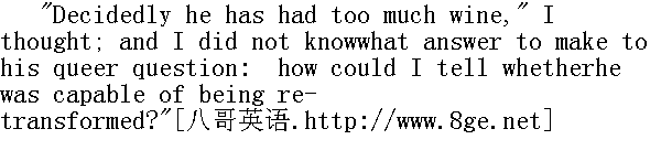 宣布完毕,他便从椅子上立起来。他伫立着,胳膊倚在大理石壁炉架上。这种姿势使他的体形像面容一样可以看得一清二楚。他的胸部出奇地宽阔,同他四肢的长度不成比例。我敢肯定,大多数人都认为他是个丑陋的男人,但是他举止中却无意识地流露出那么明显的傲慢,在行为方面又那么从容自如,对自已的外表显得那么毫不在乎,又是那么高傲地依赖其他内在或外来的特质的力量,来弥补自身魅力的缺乏。因此,你一瞧着他,就会不由自主地被他的漠然态度所感染,甚至盲目片面地对他的自信表示信服。