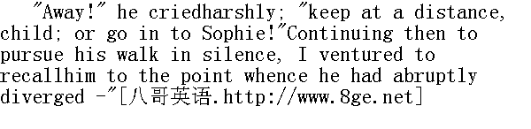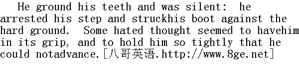 走开!"他厉声喝道,"离得远一点,孩子,要不,到里面索菲娅那儿去。"随后他继续默默地走路,我冒昧地提醒他刚才突然岔开去的话题。 "Did you leave the balcony, sir," I asked, "when Mdlle. Varensentered?"" 瓦伦小姐进屋的时候你离开了阳台吗,先生?"我问。 I almost expected a rebuff for this hardly well-timed question, but,on the contrary, waking out of his scowling abstraction, he turnedhis eyes towards me, and the shade seemed to clear off his brow."Oh, I had forgotten Celine! Well, to resume. When I saw mycharmer thus come in accompanied by a cavalier, I seemed to hear ahiss, and the green snake of jealousy, rising on undulating coilsfrom the moonlit balcony, glided within my waistcoat, and ate itsway in two minutes to my heart's core. Strange!" he exclaimed,suddenly starting again from the point. "Strange that I shouldchoose you for the confidant of all this, young lady; passingstrange that you should listen to me quietly, as if it were the mostusual thing in the world for a man like me to tell stories of hisopera-mistresses to a quaint, inexperienced girl like you! But thelast singularity explains the first, as I intimated once before:you, with your gravity, considerateness, and caution were made to bethe recipient of secrets. Besides, I know what sort of a mind Ihave placed in communication with my own: I know it is one notliable to take infection: it is a peculiar mind: it is a uniqueone. Happily I do not mean to harm it: but, if I did, it would nottake harm from me. The more you and I converse, the better; forwhile I cannot blight you, you may refresh me." After thisdigression he proceeded - 我几乎预料他会拒绝回答这个不合时宜的问题,可是恰恰相反,他从一脸愁容、茫然若失之中醒悟过来,把目光转向我,眉宇间的阴云也似乎消散了。"哦,我已经把塞莉纳给忘了!好吧,我接着讲。当我看见那个把我弄得神瑰颠倒的女人,由一个好献殷勤的男人陪着进来时,我似乎听到了一阵嘶嘶声,绿色的妒嫉之蛇,从月光照耀下的阳台上呼地窜了出来,盘成了高低起伏的圈圈,钻进了我的背心,两分钟后一直咬啮到了我的内心深处。真奇怪!"他惊叫了一声,突然又离开了话题。"真奇怪我竟会选中你来听这番知心话,年轻小姐,更奇怪的是你居然静静地听着,仿佛这是人世间再正常不过的事情,由一个像我这样的男人,把自己当歌女的情人的故事,讲给一个像你这样古怪而不谙世事的姑娘听。不过正像我曾说过的那样,后一个特点说明了前者:你稳重、体贴、细心,生来就是听别人吐露隐秘的。此外,我知道我选择的是怎样的一类头脑,来与自己的头脑沟通。我知道这是一个不易受感染的头脑,与众不同,独一无二。幸而我并不想败坏它,就是我想这么做,它也不会受影响,你与我谈得越多越好,因为我不可能腐蚀你。而你却可以使我重新振作起来。"讲了这番离题的话后,他又往下说: "I remained in the balcony. 'They will come to her boudoir, nodoubt,' thought I: 'let me prepare an ambush.' So putting my handin through the open window, I drew the curtain over it, leaving onlyan opening through which I could take observations; then I closedthe casement, all but a chink just wide enough to furnish an outletto lovers' whispered vows: then I stole back to my chair; and as Iresumed it the pair came in. My eye was quickly at the aperture.Celine's chamber-maid entered, lit a lamp, left it on the table, andwithdrew. The couple were thus revealed to me clearly: bothremoved their cloaks, and there was 'the Varens,' shining in satinand jewels,--my gifts of course,--and there was her companion in anofficer's uniform; and I knew him for a young roue of a vicomte--abrainless and vicious youth whom I had sometimes met in society, andhad never thought of hating because I despised him so absolutely.On recognising him, the fang of the snake Jealousy was instantlybroken; because at the same moment my love for Celine sank under anextinguisher. A woman who could betray me for such a rival was notworth contending for; she deserved only scorn; less, however, thanI, who had been her dupe." 我仍旧呆在阳台上。'他们肯定会到她闺房里来,'我想,'让我来一个伏击。'于是把手缩回开着的窗子、将窗帘拉拢,只剩下一条便于观察的开口。随后我关上窗子,只留下一条缝,刚好可以让'情人们的喃喃耳语和山盟海誓,'透出来,接着我偷偷地回到了椅子上。刚落座,这一对进来了。我的目光很快射向缝隙。塞莉纳的侍女走进房间,点上灯,把它留在桌子上,退了出去。于是这一对便清清楚楚地暴露在我面前了。两人都脱去了斗篷,这位'名人瓦伦'一身绸缎、珠光宝气--当然是我的馈赠--她的陪伴却一身戎装,我知道他是一个vicomet,一个年青的roue,--一个没有头脑的恶少,有时在社交场中见过面,我却从来没有想到去憎恨他,因为我绝对地鄙视他。一认出他来,那蛇的毒牙--嫉妒,立即被折断了,因为与此同时,我对塞莉纳的爱火也被灭火器浇灭了。一个女人为了这样一个情敌而背弃我,是不值得一争的,她只配让人蔑视,然而我更该如此,因为我己经被她所愚弄。 "They began to talk; their conversation eased me completely:frivolous, mercenary, heartless, and senseless, it was rathercalculated to weary than enrage a listener. A card of mine lay onthe table; this being perceived, brought my name under discussion.Neither of them possessed energy or wit to belabour me soundly, butthey insulted me as coarsely as they could in their little way:especially Celine, who even waxed rather brilliant on my personaldefects--deformities she termed them. Now it had been her custom tolaunch out into fervent admiration of what she called my 'beautemale:' wherein she differ
