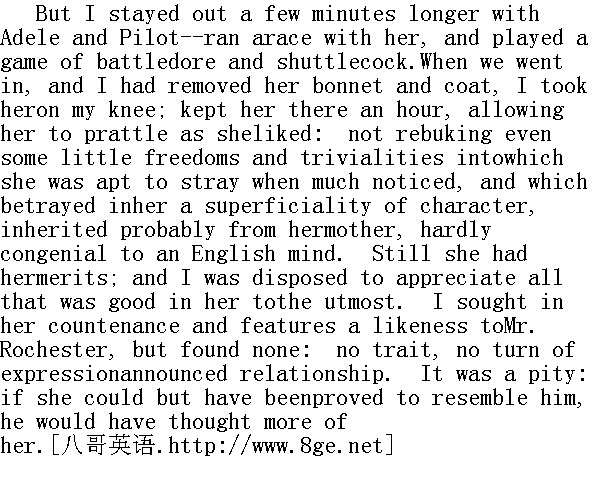 但我同阿黛勒和派洛特在外面又呆了几分钟,同她一起赛跑,还打了场板羽球。我们进屋以后,我脱下了她的帽子和外衣,把她放在自己的膝头上,坐了一个小时,允许她随心所欲地唠叨个不停,即使有点放肆和轻浮,也不加指责。别人一多去注意她,她就容易犯这个毛病,暴露出她性格上的浅薄。这种浅薄同普通英国头脑几乎格格不入,很可能是从她母亲那儿遗传来的。不过她有她的长处,我有意尽力赏识她身上的一切优点,还从她的面容和五官上寻找同罗切斯特先生的相似之处,但踪影全元。没有任何性格特色,没有任何谈吐上的特点,表明相互之间的关系。真可惜,要是能证实她确实像他就好了,他准会更想着她。 It was not till after I had withdrawn to my own chamber for thenight, that I steadily reviewed the tale Mr. Rochester had told me.As he had said, there was probably nothing at all extraordinary inthe substance of the narrative itself: a wealthy Englishman'spassion for a French dancer, and her treachery to him, were every-day matters enough, no doubt, in society; but there was somethingdecidedly strange in the paroxysm of emotion which had suddenlyseized him when he was in the act of expressing the presentcontentment of his mood, and his newly revived pleasure in the oldhall and its environs. I meditated wonderingly on this incident;but gradually quitting it, as I found it for the presentinexplicable, I turned to the consideration of my master's manner tomyself. The confidence he had thought fit to repose in me seemed atribute to my discretion: I regarded and accepted it as such. Hisdeportment had now for some weeks been more uniform towards me thanat the first. I never seemed in his way; he did not take fits ofchilling hauteur: when he met me unexpectedly, the encounter seemedwelcome; he had always a word and sometimes a smile for me: whensummoned by formal invitation to his presence, I was honoured by acordiality of reception that made me feel I really possessed thepower to amuse him, and that these evening conferences were soughtas much for his pleasure as for my benefit. 我回到自己的房间过夜,才从容地回味罗切斯特先生告诉我的故事。如他所说,从叙述的内容来看,也许丝毫没有特别的地方,无非是一个有钱的英国男人对一个法国舞女的恋情,以及她对他的背离。这类事在上流社会中无疑是司空见惯的。但是,他在谈起自己目前心满意足,并对古老的府楼和周围的环境恢复了一种新的乐趣时,突然变得情绪冲动,这实在有些蹊跷。我带着疑问思索着这个细节,但渐渐地便作罢了,因为眼下我觉得它不可思议。我转而考虑起我主人对我的态度来,他认为可以同我无话不谈,这似乎是对我处事审慎的赞美。因此我也就如此来看待和接受了。几周来他在我面前的举动己不像当初那样变化无常。他似乎从不认为我碍手碍脚,也没有动不动露出冷冰冰的傲慢态度来。有时他同我不期而遇,对这样的碰面,他似乎也很欢迎,总是有一两句话要说,有时还对我笑笑。我被正式邀请去见他时,很荣幸地受到了热情接待,因而觉得自己确实具有为他解闷的能力。晚上的会见既是为了我,也是为了他的愉快。 I, indeed, talked comparatively little, but I heard him talk withrelish. It was his nature to be communicative; he liked to open toa mind unacquainted with the world glimpses of its scenes and ways(I do not mean its corrupt scenes and wicked ways, but such asderived their interest from the great scale on which they wereacted, the strange novelty by which they were characterised); and Ihad a keen delight in receiving the new ideas he offered, inimagining the new pictures he portrayed, and following him inthought through the new regions he disclosed, never startled ortroubled by one noxious allusion. 说实在,相比之下我的话不多,不过我津津有味地听他说。他生性爱说话,喜欢向一个未见世面的人披露一点世事人情(我不是指腐败的风尚和恶劣的习气,而是指那些因为广泛盛行、新奇独特而显得有趣的世事),我非常乐意接受他所提供的新观念,想象出他所描绘的新画面,在脑海中跟随着他越过所揭示的新领域,从来不因为提到某些有害的世象而大惊小怪,或者烦恼不已。 The ease of his manner freed me from painful restraint: thefriendly frankness, as correct as cordial, with which he treated me,drew me to him. I felt at times as if he were my relation ratherthan my master: yet he was imperious sometimes still; but I did notmind that; I saw it was his way. So happy, so gratified did Ibecome with this new interest added to life, that I ceased to pineafter kindred: my thin crescent-destiny seemed to enlarge; theblanks of existence were filled up; my bodily health improved; Igathered flesh and strength. 他举手投足无拘无束,使我不再痛苦地感到窘迫。他对我友好坦诚,既得体又热情,使我更加靠近他。有时我觉得他不是我的主人,而是我的亲戚;不过有时却依然盛气凌人,但我并不在乎,我明白他生就了这付性子。由于生活中平添了这一兴趣,我感到非常愉快,非常满意,不再渴望有自己的亲人,我那瘦如新月的命运也似乎壮大了,生活中的空白已被填补,我的健康有所好转,我长了肉,也长了力。 And was Mr. Rochester now ugly in my eyes? No, reader: gratitude,and many associations, all pleasurable and genial, made his face theobject I best liked to see; his presence in a room was more cheeringthan the brightest fire. Yet I had not forgotten his faults;indeed, I could not, for he brought them frequently before me. Hewas proud, sardonic, harsh to inferiority of every description: inmy secret soul I knew that his great kindness to me was balanced byunjust severi