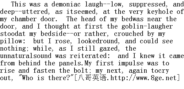 那是一阵恶魔般的笑声--压抑而低沉--仿佛就在我房门的锁孔外响起来的。我的床头靠门,所以我起初以为那笑着的魔鬼站在我床边,或是蹲在枕旁。但是我起身环顾左右,却什么也没有看到。而当我还在凝神细看时,那不自然的声音再次响起,而且我知道来自嵌板的背后。我的第一个反应是爬起来去拴好门,接着我又叫了一声"谁在那里?" Something gurgled and moaned. Ere long, steps retreated up thegallery towards the third-storey staircase: a door had lately beenmade to shut in that staircase; I heard it open and close, and allwas still. 什么东西发出了咯咯声和呻吟声。不久那脚步又退回走廊,上了三楼的楼梯。最近那里装了一扇门,关闭了楼梯。我听见门被打开又被关上,一切复归平静。 "Was that Grace Poole? and is she possessed with a devil?" thoughtI. Impossible now to remain longer by myself: I must go to Mrs.Fairfax. I hurried on my frock and a shawl; I withdrew the bolt andopened the door with a trembling hand. There was a candle burningjust outside, and on the matting in the gallery. I was surprised atthis circumstance: but still more was I amazed to perceive the airquite dim, as if filled with smoke; and, while looking to the righthand and left, to find whence these blue wreaths issued, I becamefurther aware of a strong smell of burning." 那是格雷斯.普尔吗,难道她妖魔附身了,"我想。我独个儿再也待不住了。我得去找费尔法克斯太太。我匆匆穿上外衣,披上披肩,用抖动着的手拔了门栓,开了门。就在门外,燃着一支蜡烛,留在走廊的垫子上。见此情景,我心里一惊,但更使我吃惊的是,我发觉空气十分混浊,仿佛充满了烟雾,正当我左顾右盼,寻找蓝色烟圈的出处时,我进一步闻到了一股强烈的焦臭味。